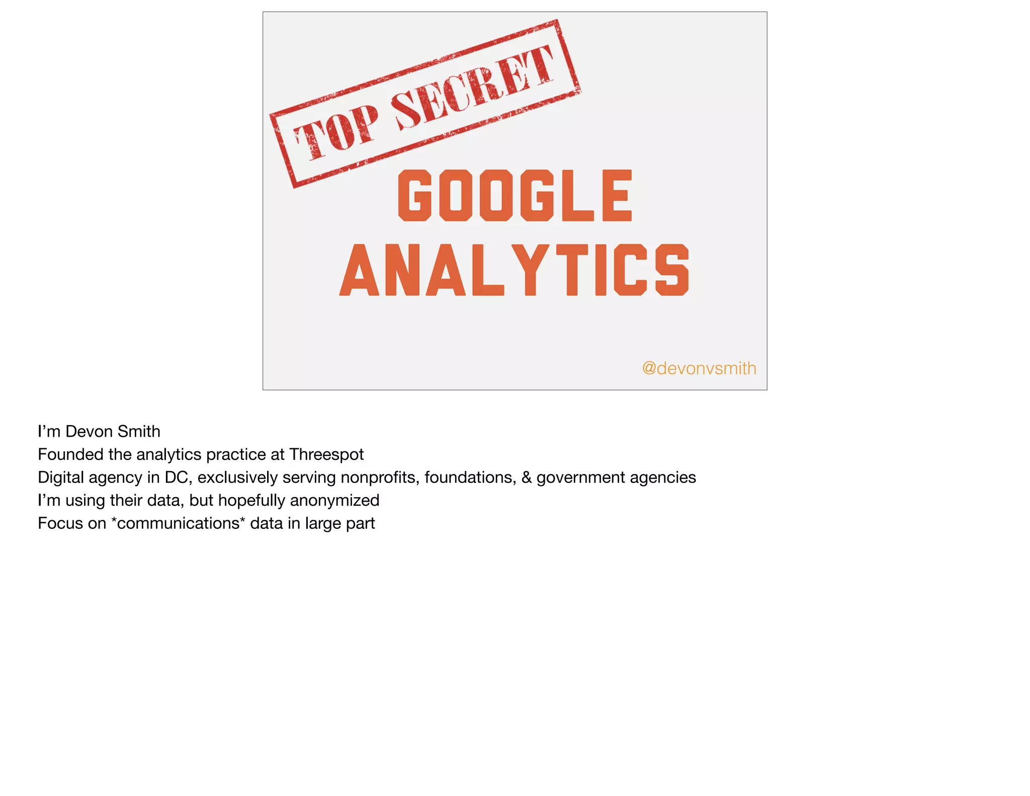 Devon Smith presents a workshop on effectively using Google Analytics (GA) for nonprofits, foundations, and government agencies, emphasizing the importance of data-driven decision-making. He outlines five critical steps for leveraging GA data, including asking targeted questions, focusing on specific data points, and implementing better data tracking practices. The session also covers essential reports, advanced segments, and practical strategies for improving website performance and understanding audience behavior.