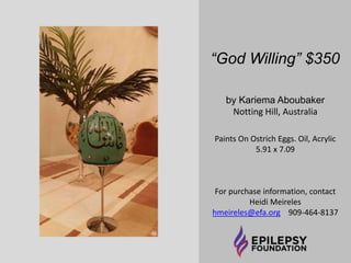 This document lists over 100 artworks available for purchase from various artists. The artworks include paintings, sculptures, photographs, and other media. Each entry provides the title, price, artist name and location, medium, dimensions, and contact information for purchasing. All purchases must be arranged through Heidi Meireles by contacting her at the provided email and phone number.