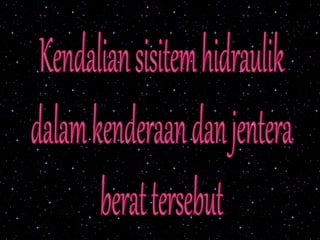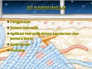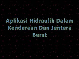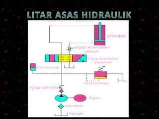 Dokumen ini memberikan penjelasan menyeluruh tentang sistem hidraulik, termasuk komponen utama seperti pam, injap, dan silinder yang berfungsi untuk menghasilkan daya melalui pemampatan cecair. Pelbagai jenis pam hidraulik dan injap kawalan dibincangkan, bersama aplikasi industri mereka dalam alat berat dan jentera. Sistem hidraulik menyokong pelbagai tugas berat dengan mengawal aliran dan tekanan bendalir untuk memindahkan kuasa dan pergerakan.