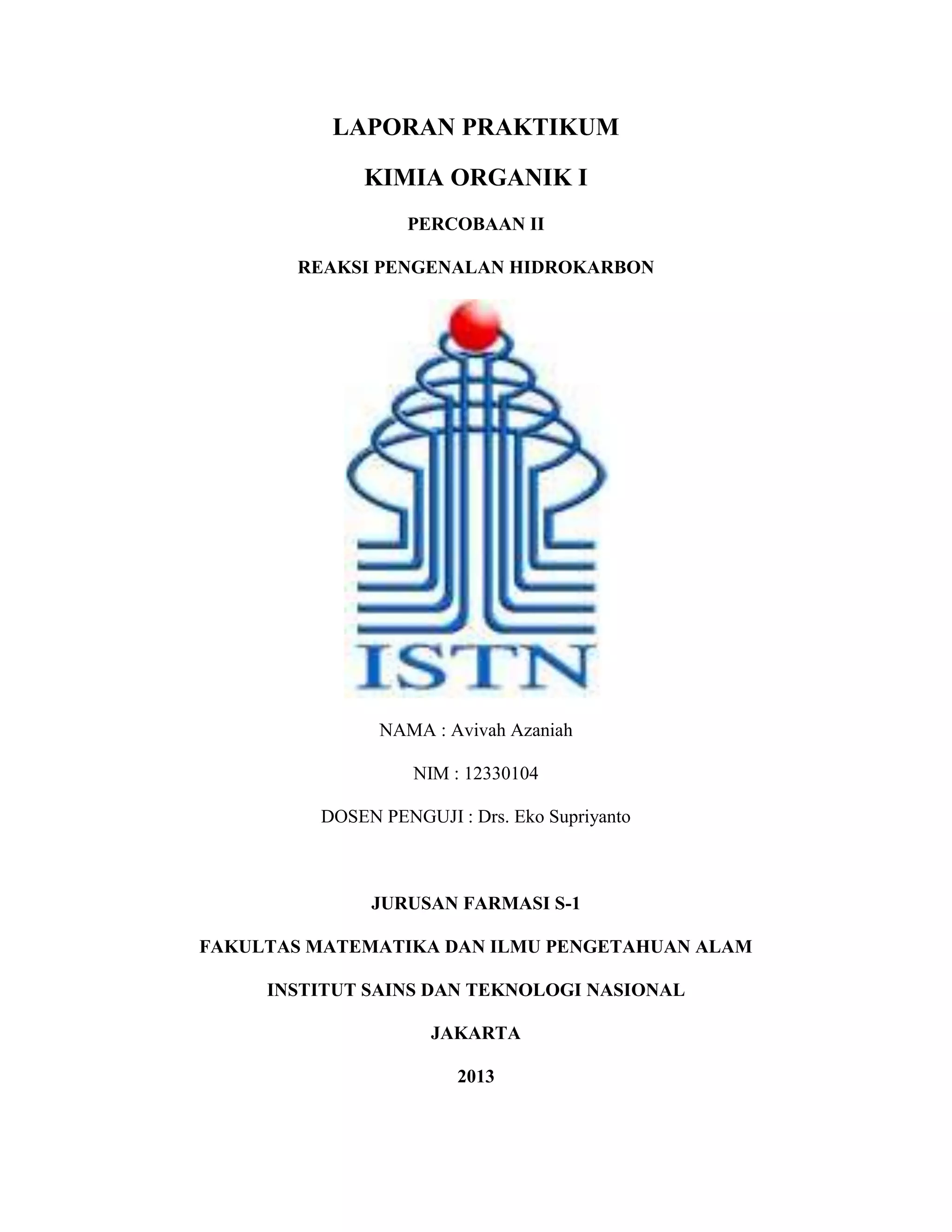 Laporan praktikum kimia organik I mengenai percobaan reaksi pengenalan hidrokarbon. Percobaan meliputi pembuatan alkana dari aldehid melalui reduksi Clemensen, uji bromine untuk mengetahui pengaruh cahaya dalam reaksi, uji Bayers untuk mengetes kereaktifan hidrokarbon terhadap oksidator, dan uji asam sulfat untuk membedakan alkana dan sikloalkana. Hasilnya menunjukkan terbentuknya alkana, terb