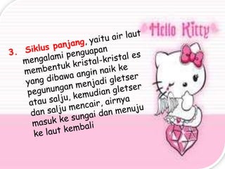 Hidrosfer adalah lapisan air di Bumi yang mencakup air permukaan, atmosfer, dan air tanah, dengan 97,2% air di lautan. Berbagai cabang ilmu mempelajari aspek-aspek air, seperti oseanografi dan hidrologi. Proses dalam siklus hidrologi mencakup evaporasi, transpirasi, dan presipitasi, yang berperan dalam pergerakan air di alam.