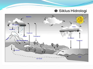 Kelompok 5 terdiri dari 5 anggota yaitu Aryo Iswan, Indah Aretha, Mentari P.A, M.Reza Al Haddad, dan Reva Kurniawan B.P. Dokumen membahas tentang siklus hidrologi, komponen yang terjadi dalam siklus hidrologi, perairan darat seperti air tanah, sungai, danau, dan rawa beserta karakteristik dan manfaatnya. Air permukaan dan tanah memiliki berbagai potensi yang bermanfaat