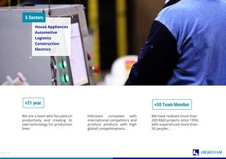 Hidrotam is a specialized manufacturer with over 21 years of experience, offering innovative solutions in sheet metal production across various sectors including automotive and house appliances. They focus on productivity, having completed over 200 R&D projects, and provide fully automated production lines with CE certification for multiple applications. Their technology includes advanced CAD/CAM/PLM systems, custom-designed lines, and efficient CNC bending and rolling systems to minimize waste and enhance operational efficiency.