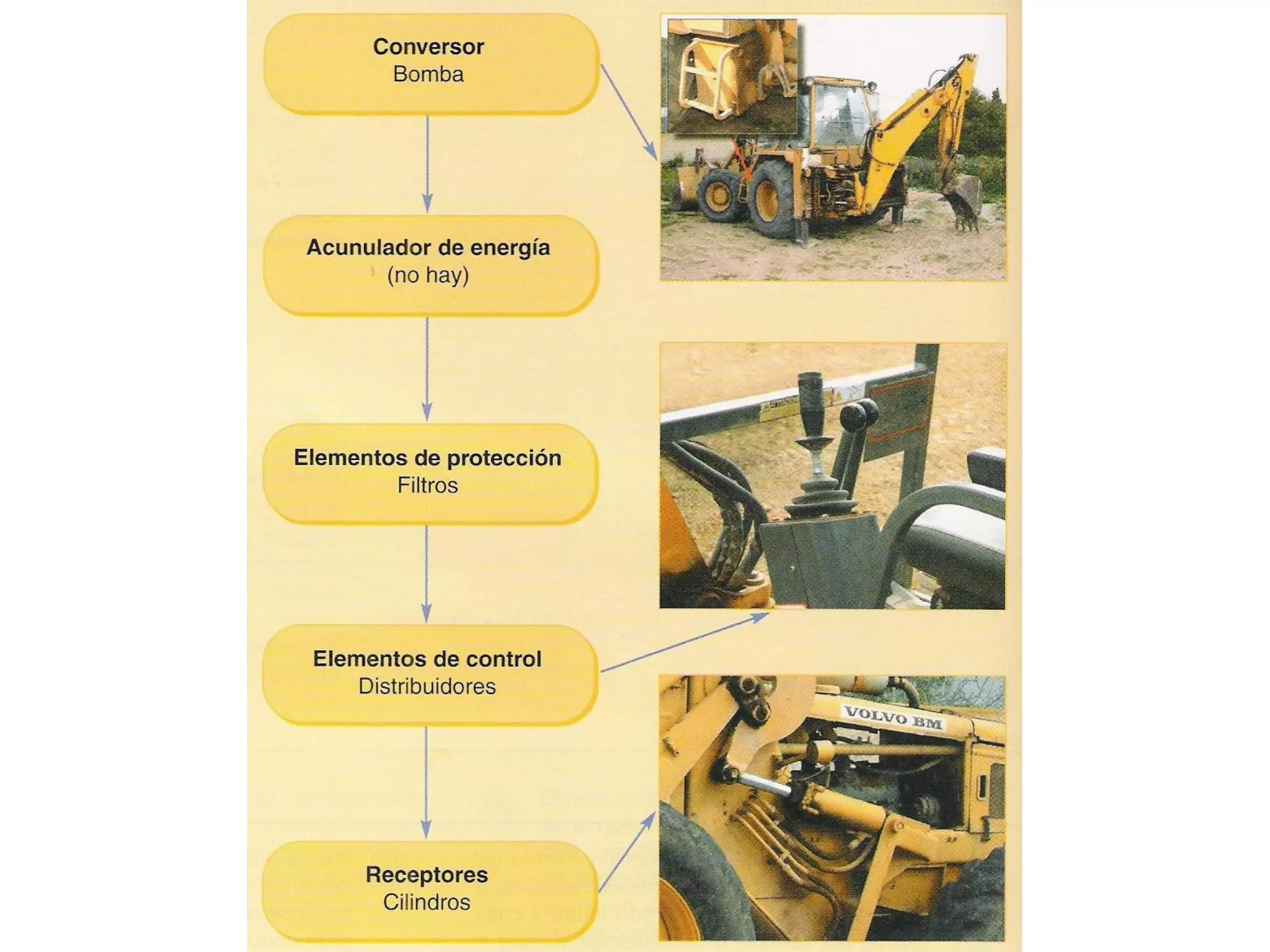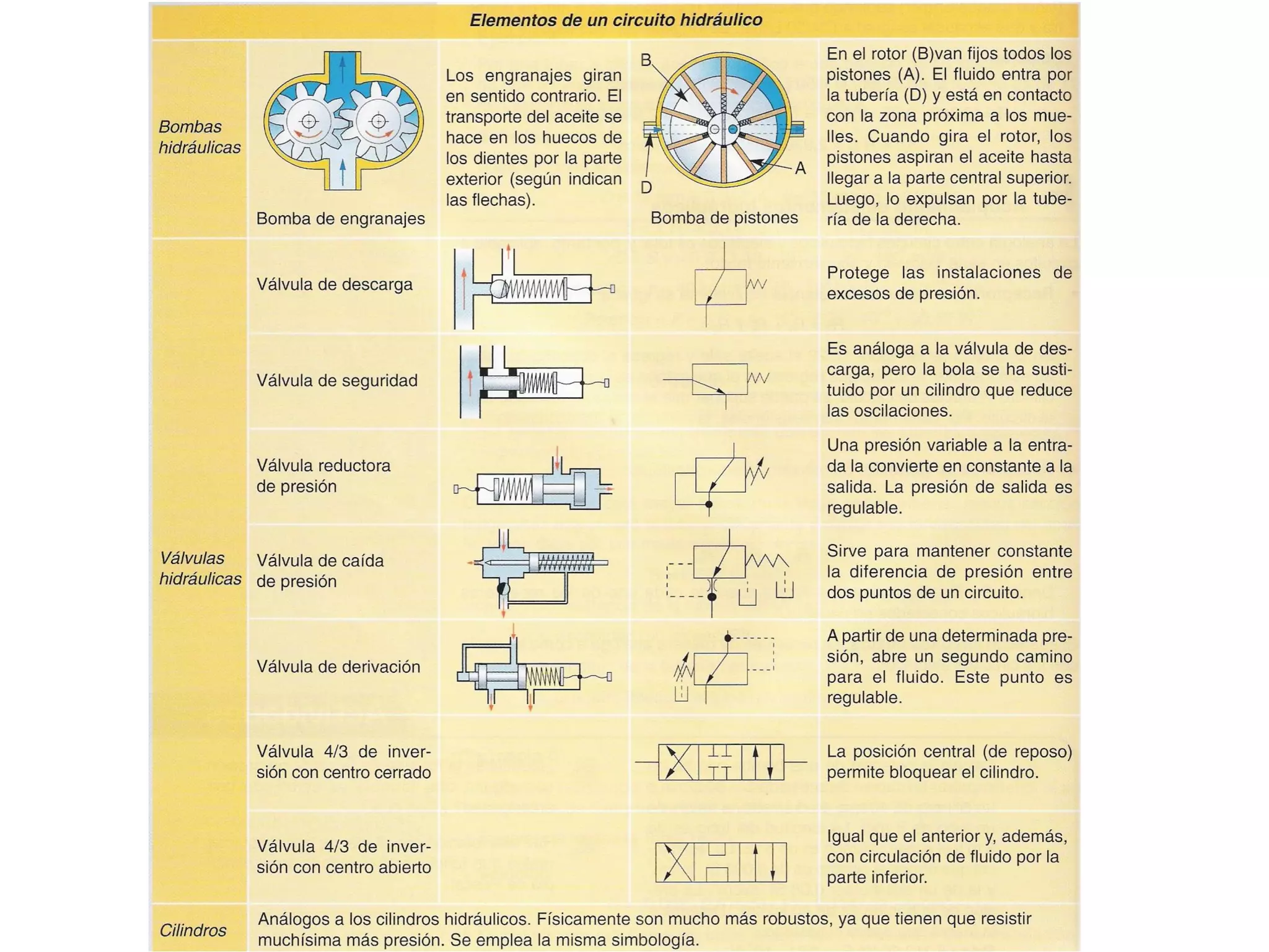 Os elementos dun circuíto hidráulico son análogos aos pneumáticos; de feito,