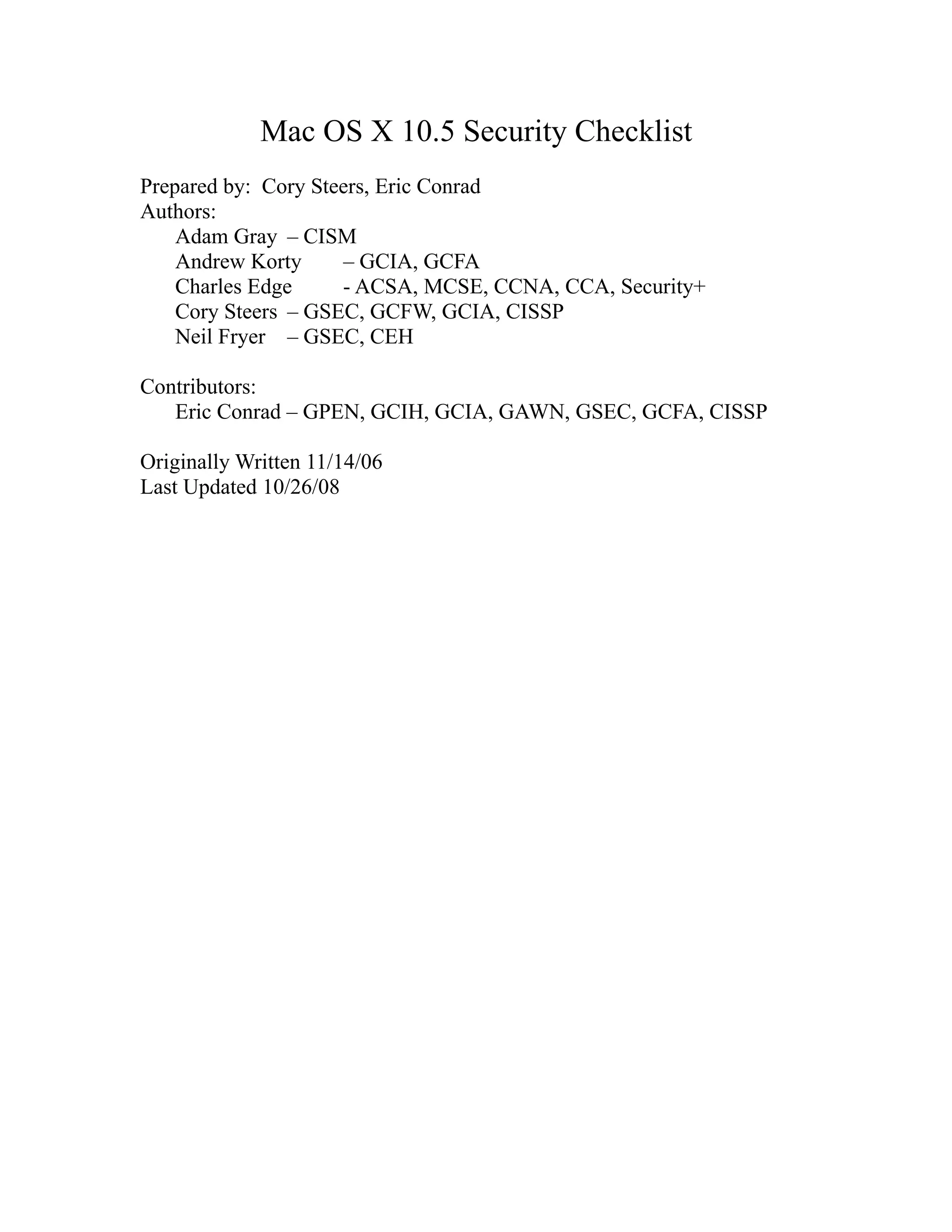 This document provides a checklist for securing Mac OS X version 10.5, focusing on hardening the operating system, securing user accounts and administrator accounts, enabling file encryption and permissions, implementing intrusion detection, and maintaining password security. It describes the Unix infrastructure and security framework that Mac OS X is built on, leveraging open source software and following the Common Data Security Architecture model. The checklist can be used to audit a system or harden it against security threats.