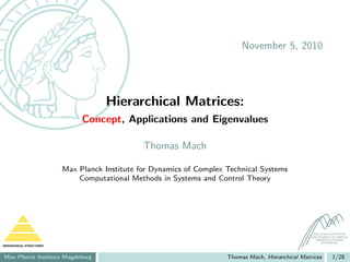 The document discusses hierarchical matrices (H-matrices), which provide an efficient storage format that lies between dense and sparse matrices. H-matrices can be used to solve problems involving integral equations more efficiently than with dense matrices. The document covers H-matrix concepts, applications to problems like electrostatics, and computing eigenvalues with H-matrices.