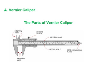 The document describes two high accuracy measuring devices: the vernier caliper and micrometer. The vernier caliper contains scales to measure internal and external lengths in both inches and millimeters, as well as a depth probe. To take a measurement, you read the centimeter mark on the fixed scale and the millimeter mark that lines up on the vernier scale, then add any millimeters indicated on the vernier scale. The micrometer uses a rotating thimble to precisely measure thickness between fixed rods, reading the millimeter mark on the barrel and hundredths mark on the thimble, then adding them together. Both devices provide precise linear measurements down to hundredths of a millimeter.