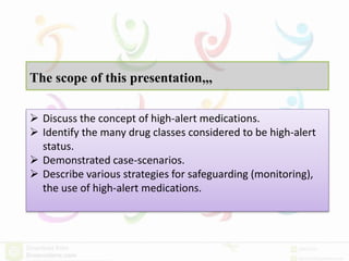 This presentation discusses high-alert medications, which are drugs that carry an increased risk of harming patients if used incorrectly. It identifies common classes of high-alert medications like opioids, insulin, and anticoagulants. Case scenarios are presented to demonstrate potential harms from improper use. Strategies are described for safely monitoring high-alert medications through standardization, redundancy checks, simplifying processes, and close patient monitoring.