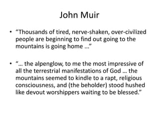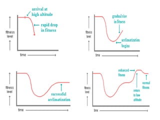 John Muir found being in the mountains calming and spiritual. High altitude was defined as between 1,500-3,500 meters and extreme altitude was above 5,500 meters. The body acclimatizes to high altitude through immediate responses like increased breathing and heart rate, intermediate responses over days like increased red blood cells, and long term responses over weeks like growth of lung capillaries and more efficient use of oxygen. Generations that live at high altitude like Tibetans have developed genetic adaptations through natural selection that augment the acclimatization process.