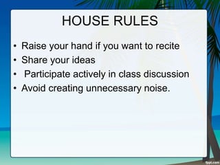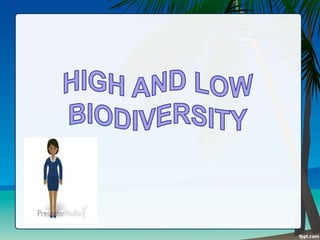 The document provides information about house rules, a puzzle activity, and different levels of biodiversity. It discusses raising your hand and avoiding noise for the house rules. For the puzzle activity, students must arrange a puzzle on the board within 1 minute. It then differentiates between high and low biodiversity ecosystems. High biodiversity ecosystems have many species while low biodiversity do not. Specific ecosystems like rainforests and mountains are identified as having high biodiversity.