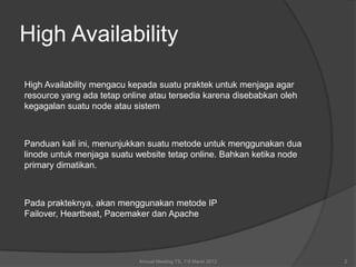 The document outlines a method for achieving high availability on an Ubuntu server using IP failover, heartbeat, and pacemaker, demonstrated through the use of two Linodes to keep a website online during node failures. It provides detailed instructions for configuring static IP addresses, installing necessary packages, setting up Apache, configuring heartbeat, and monitoring cluster resources. The guide emphasizes that the provided configuration is tailored for static sites and may not suit all high availability scenarios.