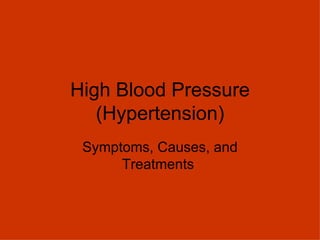 Hypertension, also known as high blood pressure, is a common condition where blood pressure in the arteries is consistently too high. It puts extra strain on the heart and arteries and increases the risk of heart disease, stroke, and kidney disease if left untreated. Symptoms of high blood pressure are often nonexistent in the early stages. Treatment involves lifestyle changes like following the DASH diet, exercising regularly, limiting sodium intake, weight control, and reducing stress as well as medication if needed. Keeping blood pressure under control can significantly reduce health risks.