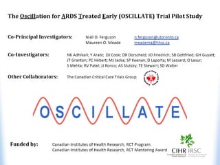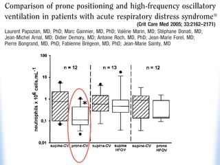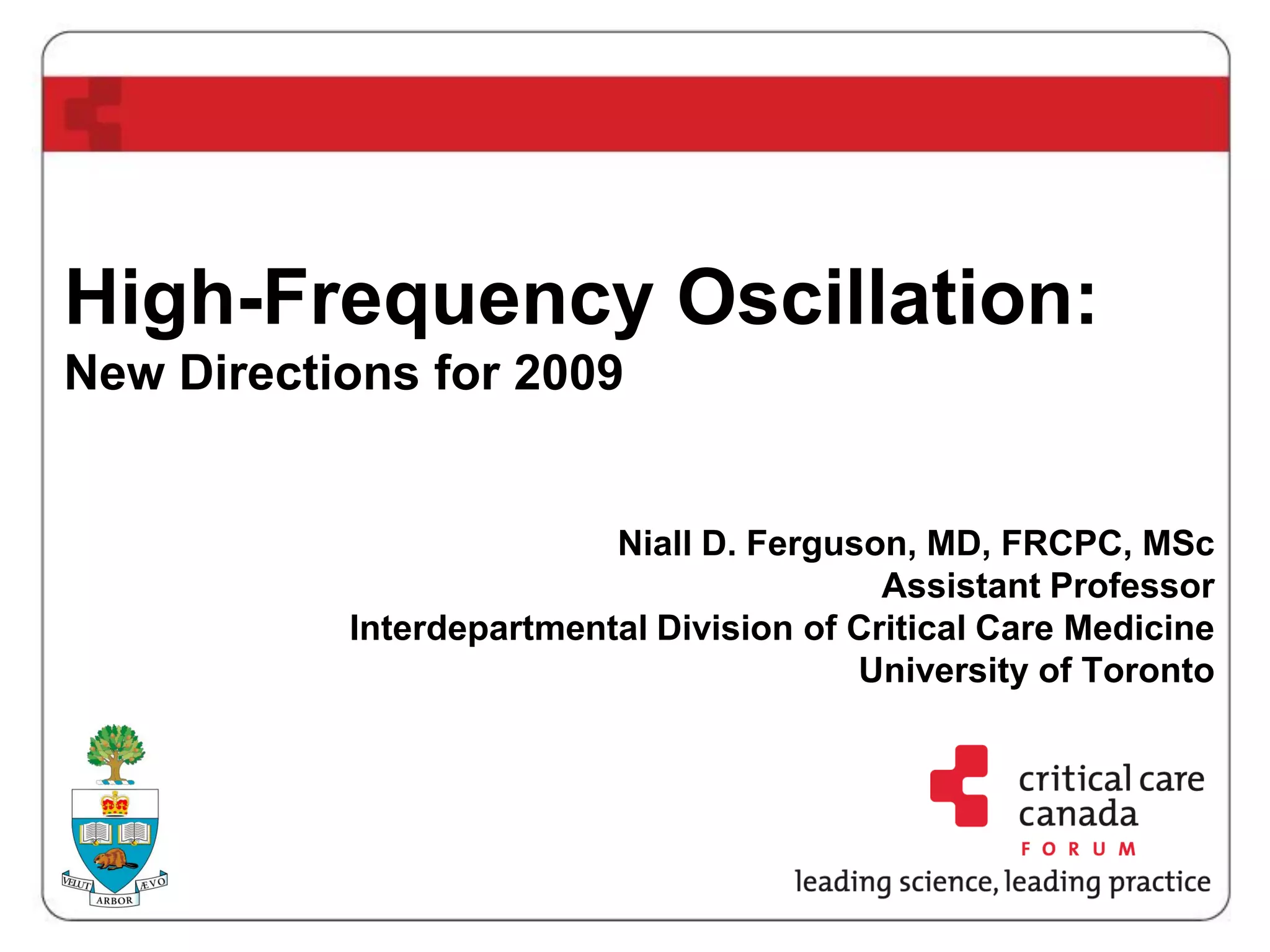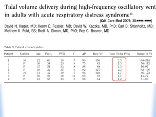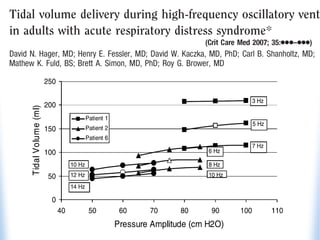 High-frequency oscillatory ventilation (HFOV) is proposed as a strategy to prevent ventilator-induced lung injury (VILI) in patients with acute respiratory distress syndrome (ARDS), with evidence indicating it may improve oxygenation and reduce mortality. The document discusses the implementation of HFOV, including candidate selection, timing, and techniques for recruitment, while emphasizing the importance of minimizing tidal volume and managing oxygenation. Further research is needed to fully understand HFOV's benefits and outcomes compared to conventional ventilation methods.