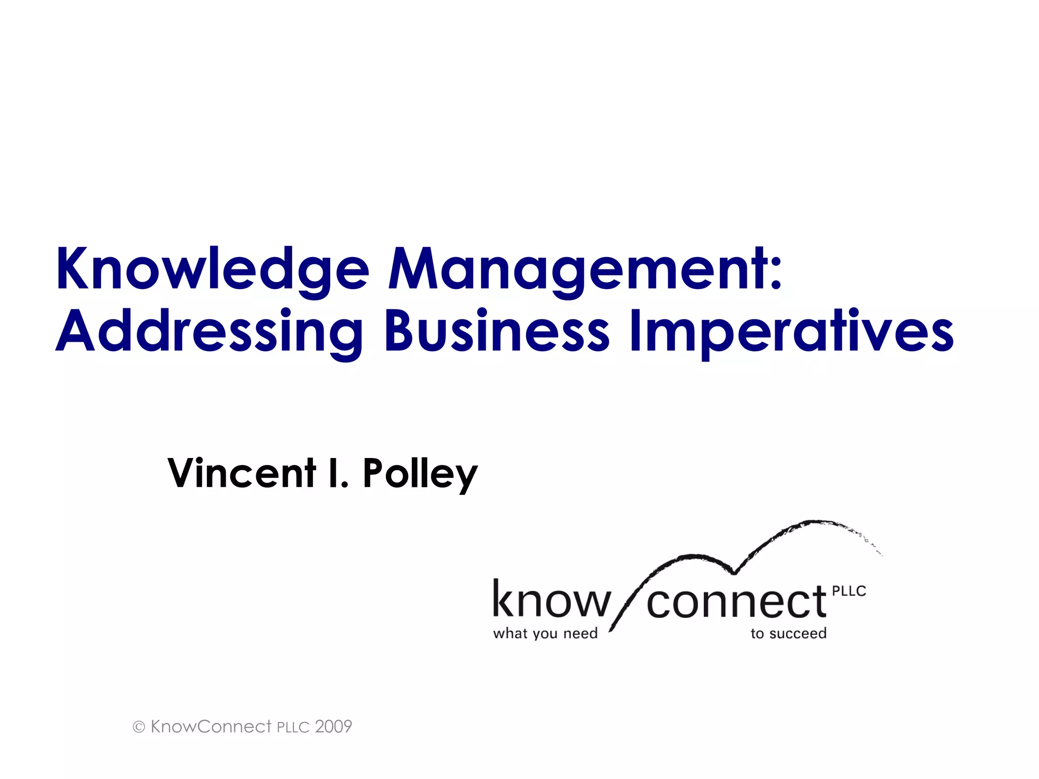 The document discusses the importance of knowledge management (KM) in addressing business challenges, emphasizing the need for systematic approaches to ensure information flows effectively to the right people. It outlines various drivers for KM, such as cost pressures, compliance, and the importance of fostering a collaborative culture within organizations. Additionally, it highlights techniques for implementing KM and the critical role of people and culture in its success.