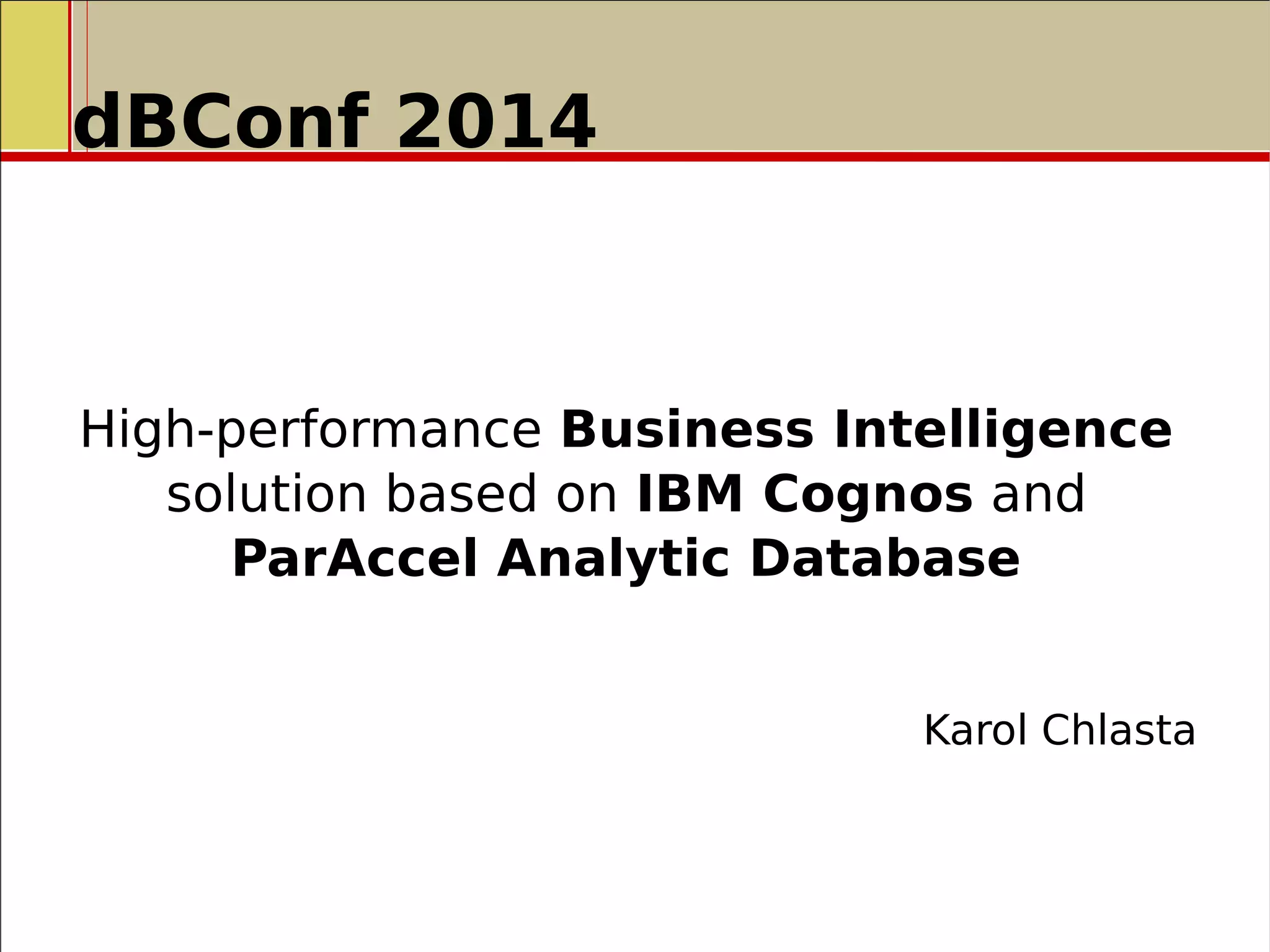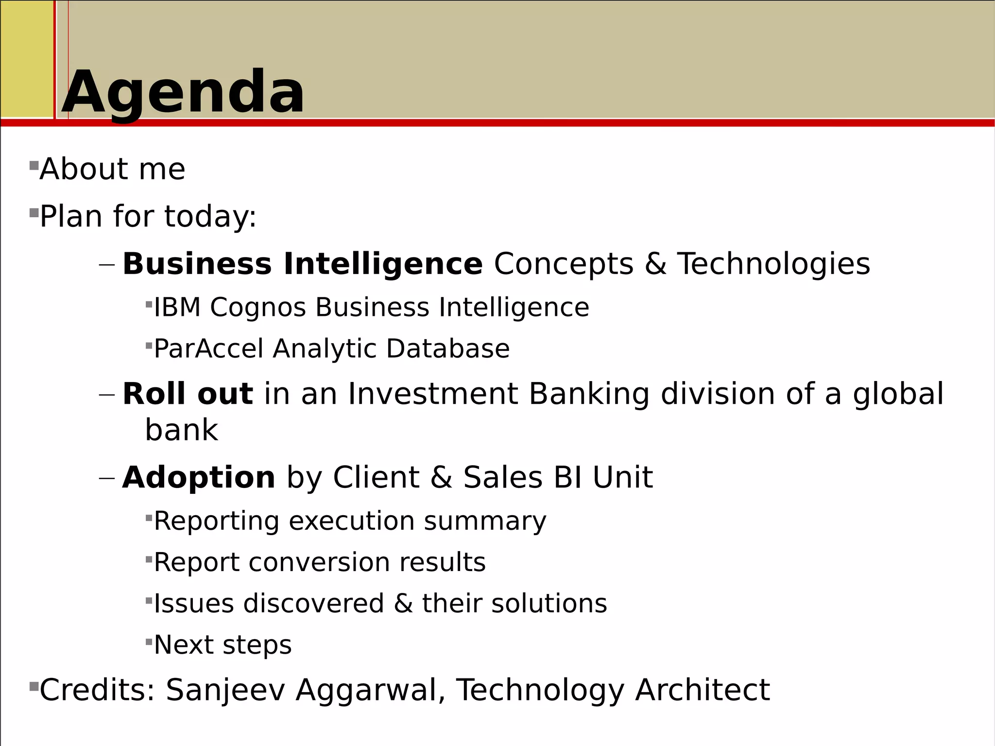 The document outlines a presentation on the implementation of a high-performance business intelligence solution using IBM Cognos and the Paraccel analytic database. It discusses key business intelligence concepts, the benefits of advanced analytics, and the successful rollout of the technology in a global investment banking division, which significantly improved reporting execution times and reduced data latency. The presentation concludes with recommendations for further enhancements and optimizations following the implementation.