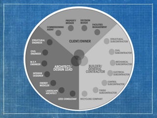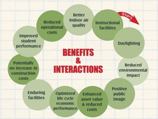 The document discusses high-performance building design, emphasizing the importance of green buildings in reducing CO2 emissions and presenting case studies of LEED Platinum projects. It outlines an integrated design process for achieving net-zero emissions, highlighting key strategies such as site selection, passive solar design, and occupant engagement. Additionally, it addresses common concerns like first-cost barriers and the need for continuous performance monitoring to ensure successful energy and efficiency outcomes.