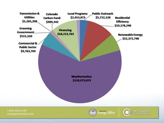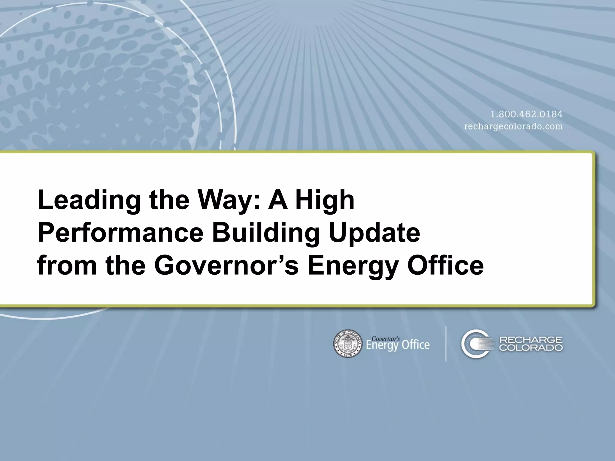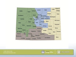 The document outlines updates from the Governor's Energy Office regarding Colorado's initiatives for enhancing energy efficiency and promoting renewable energy. It highlights the growth of the clean energy sector, the implementation of rebate programs for residential and commercial properties, and various strategies to facilitate access to energy efficiency services and financing. Furthermore, it discusses the 'Recharge Colorado' campaign aiming to engage citizens in becoming active participants in the state's clean energy transition.