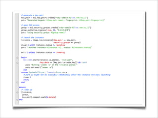 This document discusses high performance cloud computing. It covers 1) cloud infrastructure like EC2 instance types, 2) tools for provisioning and managing cloud resources such as AWS CloudFormation and Chef, 3) example HPC applications that can run on the cloud including genomics tools, and 4) best practices around optimizing costs and resources for high performance computing workloads in the cloud.