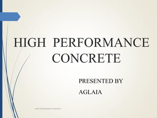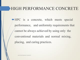 High Performance Concrete (HPC) is designed for special performance and uniformity using unconventional materials and practices. Its key characteristics include low porosity, high strength, and durability, making it suitable for applications like highway pavements and high-rise buildings. While it offers benefits such as reduced construction time and lower maintenance costs, it requires careful manufacturing and has a higher initial cost.