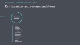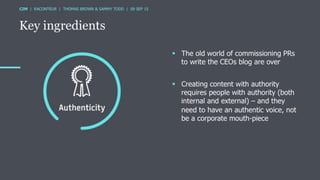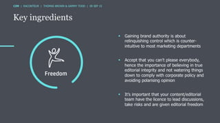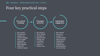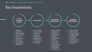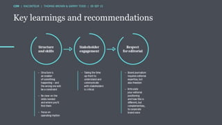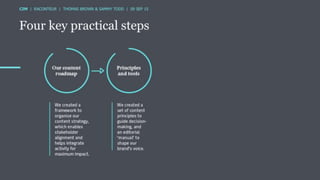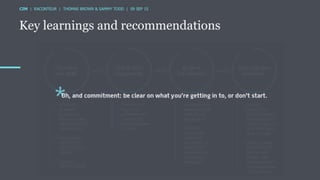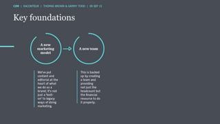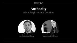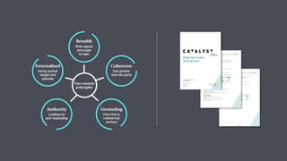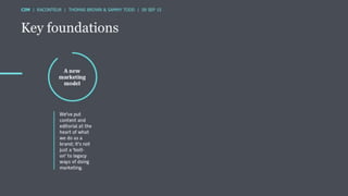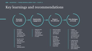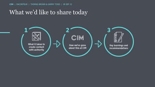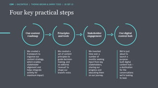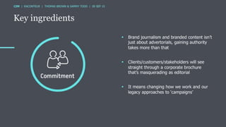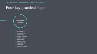 The document discusses the ROI of content marketing, emphasizing its role as a long-term investment aimed at increasing conversion, customer retention, and overall profit. It presents examples and statistics illustrating successful ROI measurements and stresses the need for strategic approaches to improve content marketing effectiveness. Additionally, it highlights the importance of integrating brand content with sales efforts and making informed advertising decisions.