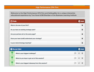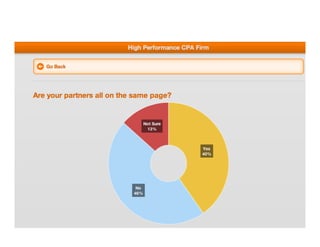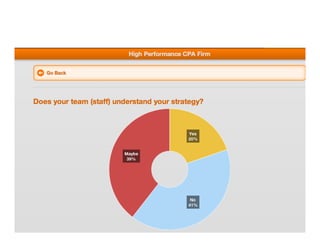 The document discusses challenges and strategies for building high-performance CPA firms, emphasizing the need for unified vision, growth in a mature market, and the importance of employee engagement. Key issues include retaining talent, managing succession, and adapting to market changes while maintaining effective leadership and culture. The presentation advocates for strategic planning, alignment throughout the organization, and continuous learning as essential components for success in a competitive landscape.
