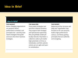 จากการศึกษา 3 บริษัทที่ประสบความสำเร็จ (BlackRock: U.S.A., Envision Energy: China, TATA Group: India) พบว่ามีแนวทางที่เหมือนกันคือ การขับเคลื่อนด้วยจุดมุ่งหมาย เน้นการสร้างผลงาน มีหลักในการนำ และมีกลยุทธ์คนเก่งที่เป็นเยี่ยม (purpose-driven, performance oriented, principles-led, and superior talent strategies)