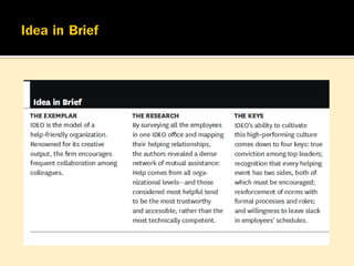 IDEO เป็นบริษัทที่มีความเป็นเลิศ โดยมีความร่วมมือกันของบุคลากร เป็นหนึ่งในปัจจัยของวัฒนธรรมองค์กร ความร่วมมือกันโดยได้ผลประโยชน์ร่วมกัน จะเห็นได้ชัดในบริษัทที่บุคลากรต้องใช้ความรู้และความคิดสร้างสรรค์ในการทำงาน