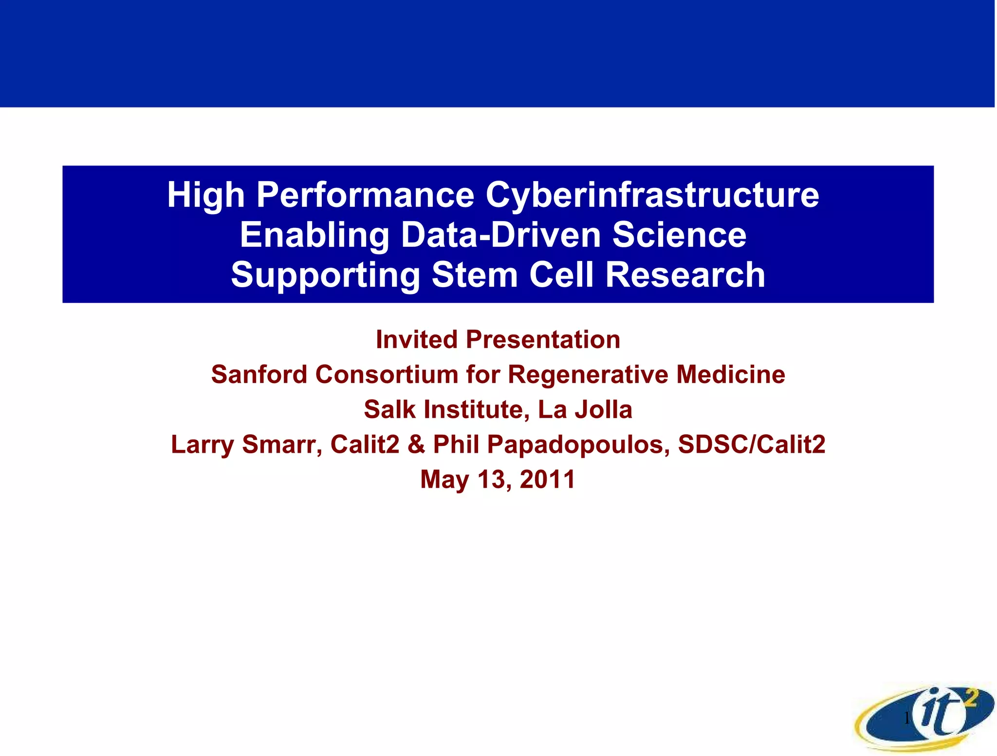 The document discusses advancements in high-performance cyberinfrastructure at UC San Diego, focusing on enabling data-driven science for stem cell research and other fields. It highlights the deployment of a 10 Gbps network and various computational resources, such as the Triton data analysis facility and shared storage solutions, to address the challenges of massive data processing. Additionally, it outlines collaborative efforts and ongoing projects that aim to enhance scientific research capabilities through optimized data storage and analysis techniques.
