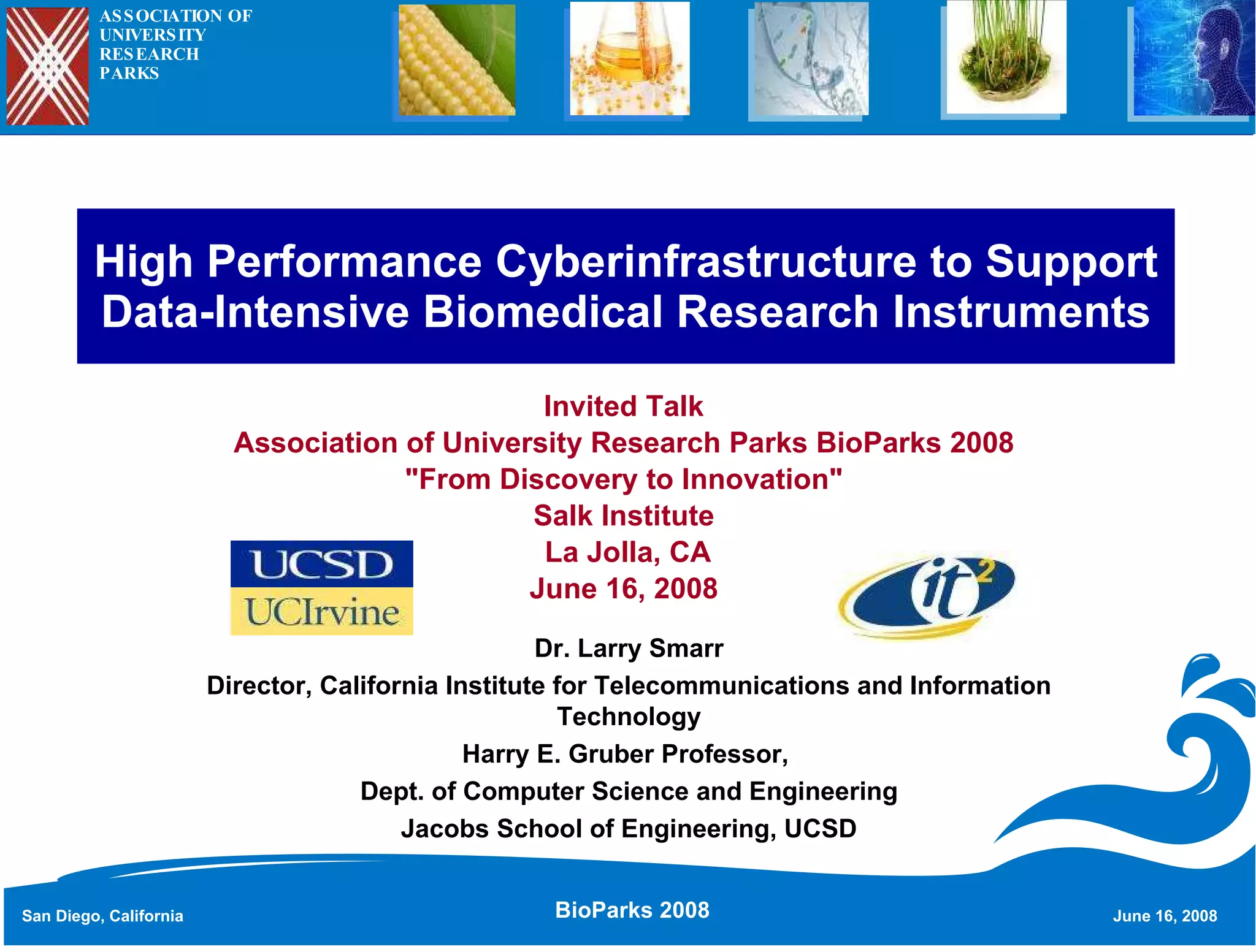 The document discusses the advancements in high-performance cyberinfrastructure at Calit2, aimed at supporting data-intensive biomedical research through 10 gigabit/s optical connections. It highlights collaborations among over 350 researchers and partnerships with over 130 companies to enhance technology integration in biomedical research facilities. Key initiatives include a focus on metagenomics and the creation of dedicated optical networking to facilitate rapid access to essential research data and instruments.