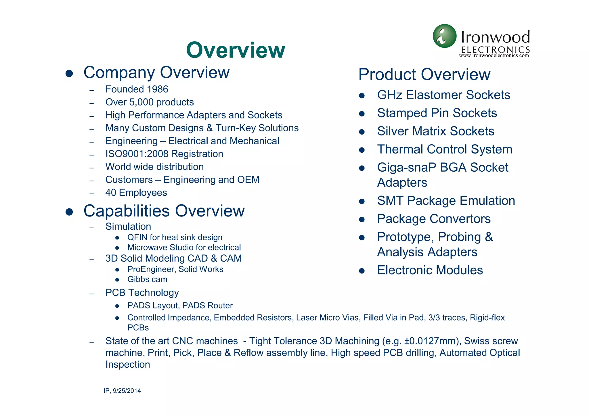 The document provides an overview of a company specializing in high-performance IC sockets and test adapters, detailing over 5,000 products and their engineering capabilities. It highlights various socket types, including elastomer sockets, stamped pin sockets, and production/burn-in sockets, alongside custom design options and state-of-the-art manufacturing technologies. The document also outlines the company's commitment to continuous improvement and customer-specific solutions within a short production timeline.