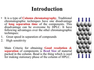 The document discusses High Performance Liquid Chromatography (HPLC). It states that HPLC provides faster separation of compounds compared to other chromatographic techniques due to the use of smaller bead sizes in columns and high pressure pumps. Smaller bead sizes allow for sharper separation but reduce flow rates, which is overcome by applying high pressure. Therefore, HPLC achieves very high resolution and faster separation using smaller bead sizes and high pressure pumps.