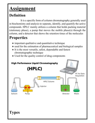 High performance liquid chromatography (HPLC) is a technique used to separate compounds in a mixture based on their interactions with a stationary phase and a liquid mobile phase. It is commonly used in biochemistry to identify and quantify compounds. There are several types of HPLC that use different stationary and mobile phase combinations including normal phase, reversed phase, size exclusion, and ion exchange chromatography. HPLC has many parameters that can be adjusted including column diameter, particle size, pore size, and pump pressure. It has wide applications in fields like pharmaceuticals, environmental analysis, forensics, clinical analysis, and food and flavor analysis.