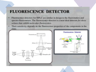 High Performance Liquid Chromatography (HPLC) is a separation technique that involves injecting a small volume of liquid sample into a column packed with tiny particles. Individual components of the sample are then transported through the column by a mobile phase and separated based on interactions with the stationary phase. These separated components exit the column and are detected, providing a chromatogram. HPLC uses small particle sizes, high column pressures up to 6000-9000 psi, and flow rates of 1-3 mL/min to achieve fast, efficient, and high resolution separations of both volatile and non-volatile compounds.