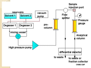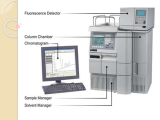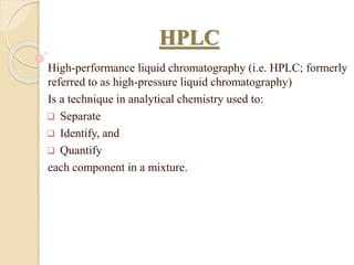 High-performance liquid chromatography (HPLC) is an analytical chemistry technique used to separate, identify, and quantify components in mixtures. It works by forcing a pressurized liquid solvent through a column packed with adsorbent particles under high pressure. This allows for better separation than traditional column chromatography due to smaller particle sizes and detection methods. HPLC has applications in manufacturing, legal, research, and medical fields such as drug analysis, food testing, and pharmaceutical development.