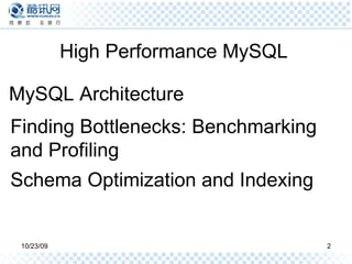The document discusses various topics related to optimizing performance in MySQL databases, including: