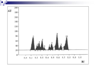 This document provides an overview of high performance thin layer chromatography (HPTLC). It describes the principles, methodology, and applications of HPTLC. Some key points include:
