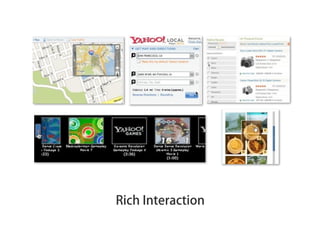 The document discusses high performance web design. It covers measuring performance using tools like YSlow and PageSpeed, as well as techniques to improve performance such as reducing HTTP requests by combining scripts and stylesheets, using CSS sprites, and inline images. The document also discusses how performance impacts businesses and provides examples of component weights and grades for different websites according to YSlow rules. It emphasizes the importance of clear objectives, consistent design, and clean code for building high performance sites.