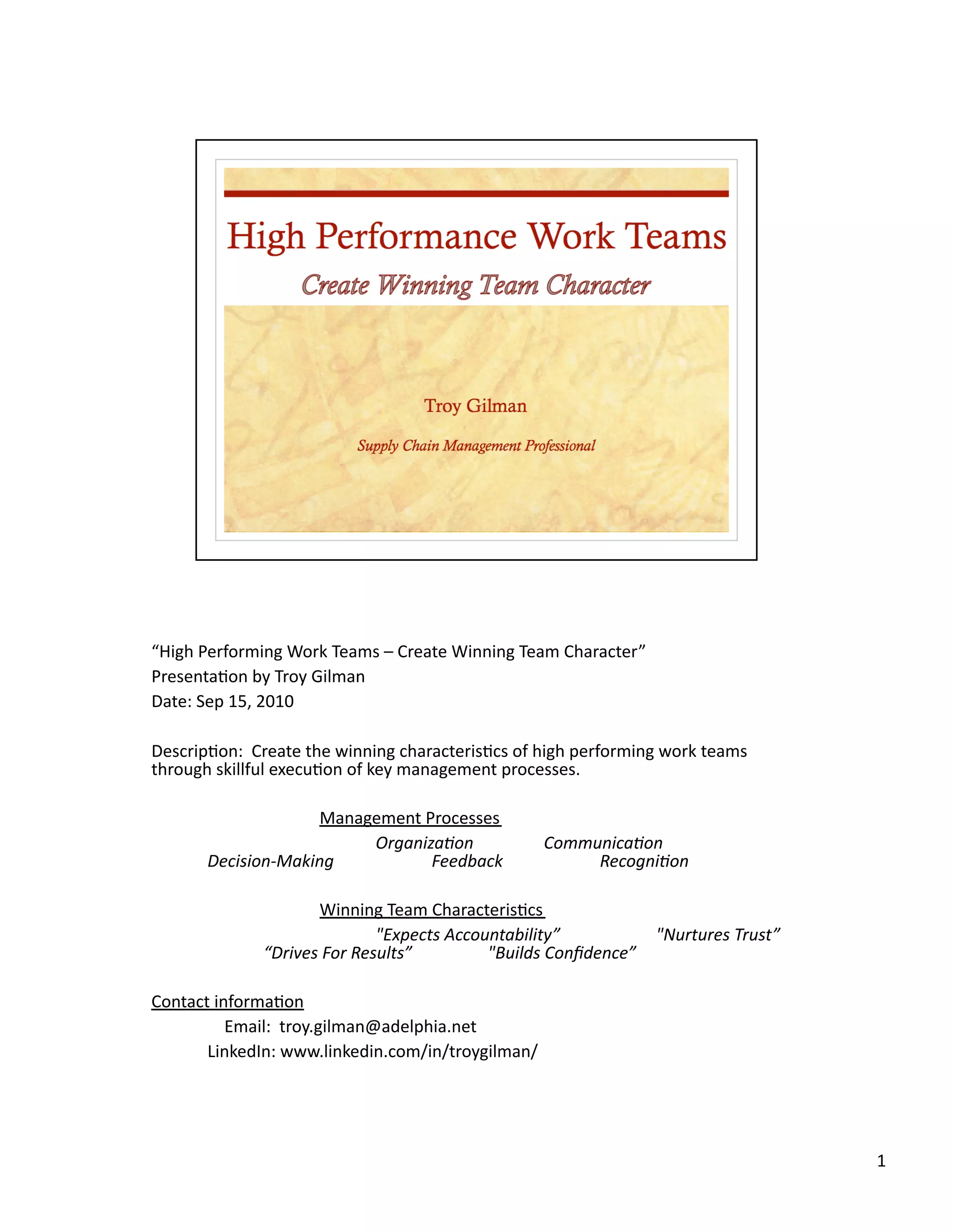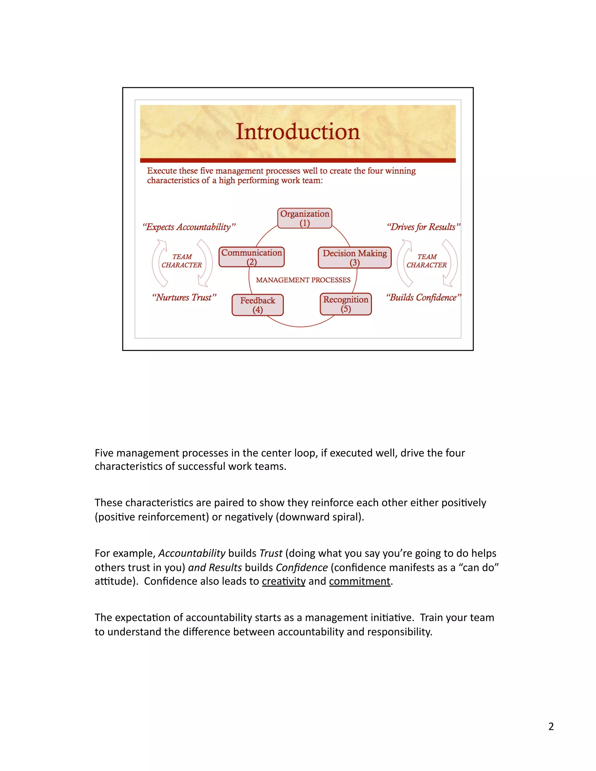 This document summarizes key aspects of creating high performing work teams through effective management processes and developing winning team characteristics. It discusses five core management processes - organization, communication, decision-making, feedback, and recognition. If executed well, these processes can drive four characteristics of successful teams: accountability, trust, drive for results, and confidence. The document provides examples and recommendations for how to strengthen each management process and characteristic.