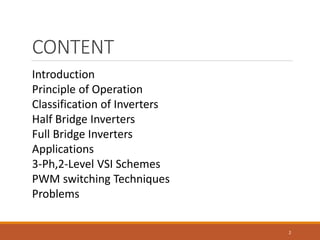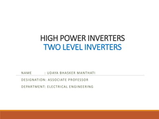 This document discusses high power inverters, including two-level inverters, classifications of inverters, half bridge and full bridge inverter configurations, pulse width modulation techniques like unipolar and bipolar switching, three-phase two-level voltage source inverters, and space vector modulation. It provides examples of performance parameters like frequency modulation ratio and amplitude modulation ratio. Equations for calculating output voltage, current, and power are also presented.