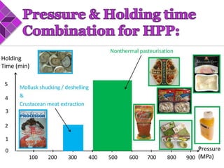 High pressure processing (HPP) is a non-thermal food preservation technique that uses high water pressure to kill microorganisms and inactivate enzymes in food. It allows foods to be preserved without heat, maintaining texture, flavor and nutrition. HPP uses pressures of 100-1000 MPa for a few minutes to kill pathogens and extend shelf life. It has been widely adopted since the 1990s for products like guacamole, juices and dairy. HPP provides a safe alternative to thermal pasteurization and allows preservation of thermosensitive qualities in foods like proteins and vitamins.