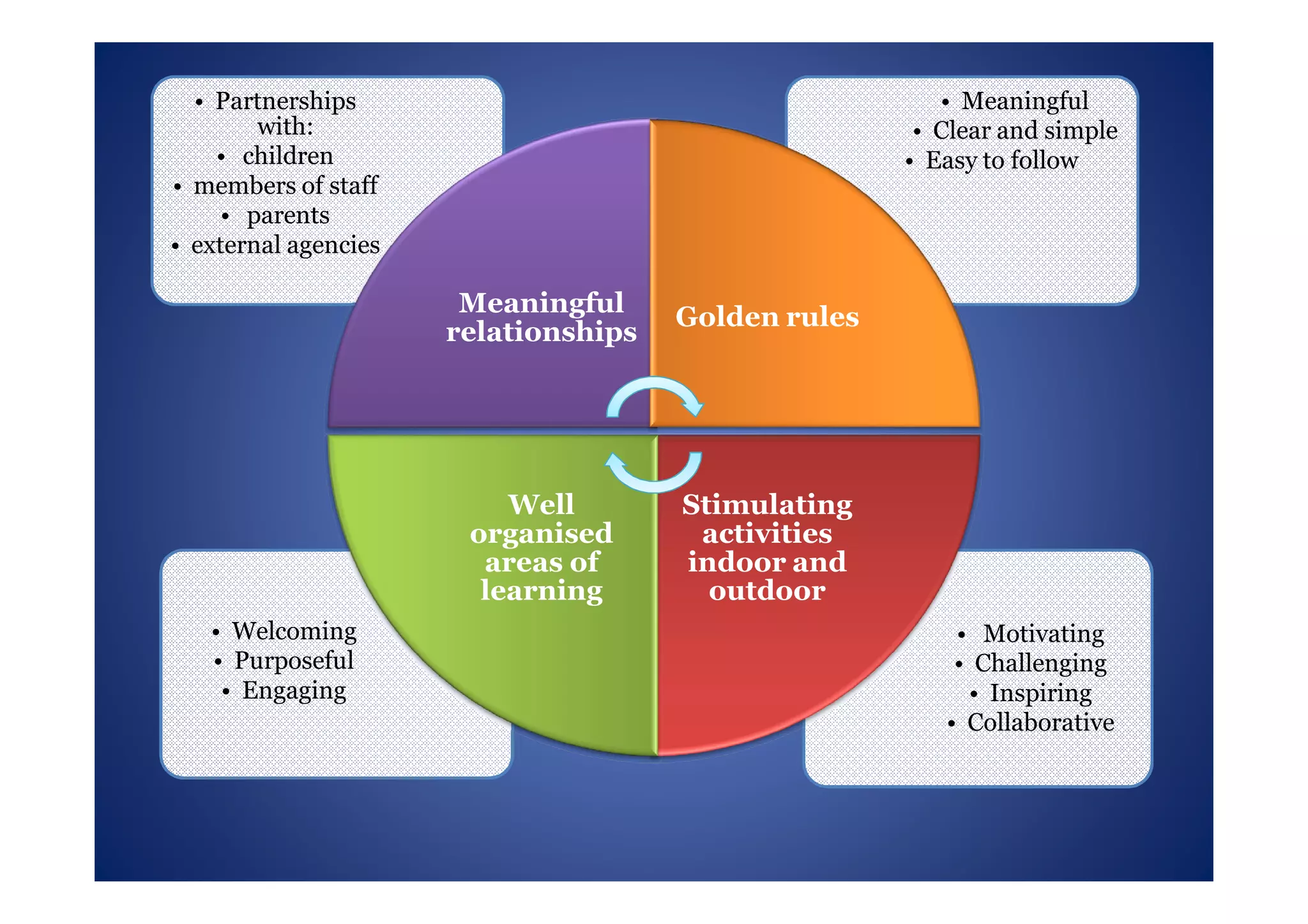 The document discusses the importance of creating a high-quality learning environment for children in the early years, emphasizing partnerships between staff, parents, and external agencies. It highlights various areas that stimulate creativity, such as writing, music, and role play, and stresses the significance of children's experiences in shaping their future. Additionally, it references early childhood education methodologies and research that support the need for nurturing and engaging learning environments.