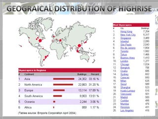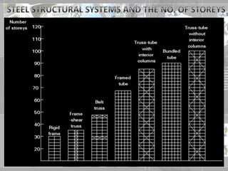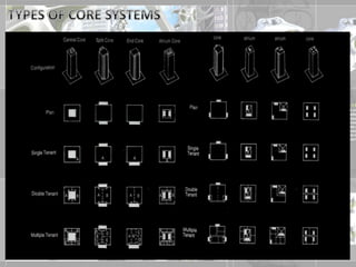 The document provides an overview of different structural systems used in high-rise buildings, including framed tube structures, belt truss systems, bundled tube systems, tube-in-tube systems, and diagrid systems. It also discusses various construction materials, foundations, and construction methods for high-rise buildings such as slip forming, climb forming, jump forming, and tunnel forming. The structural systems allow for wider column spacing to provide large interior spaces while effectively resisting wind and seismic loads.