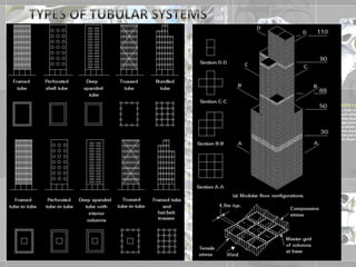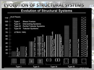 The document discusses high-rise structural systems, defining high-rise buildings through various standards and focusing on different construction methods such as shear walls, framed tube structures, and slip forming. It covers the materials used, advantages and disadvantages, and methods like jump form and tunnel form, emphasizing efficiency in construction. Additionally, the document highlights specific structural innovations like the trussed tube and bundled tube systems for enhanced lateral resistance.