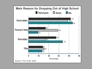 High school dropout rates have declined since the 1970s but remain a significant problem. Reasons students drop out include low grades, feelings of unsafety, inability to get along with peers, pregnancy, family issues, and substance abuse. Dropping out has negative lifelong consequences, including much lower annual and lifetime earnings, higher rates of unemployment, poverty, poor health, and incarceration. As teachers, addressing the dropout issue will be important to help students graduate and achieve better life outcomes.