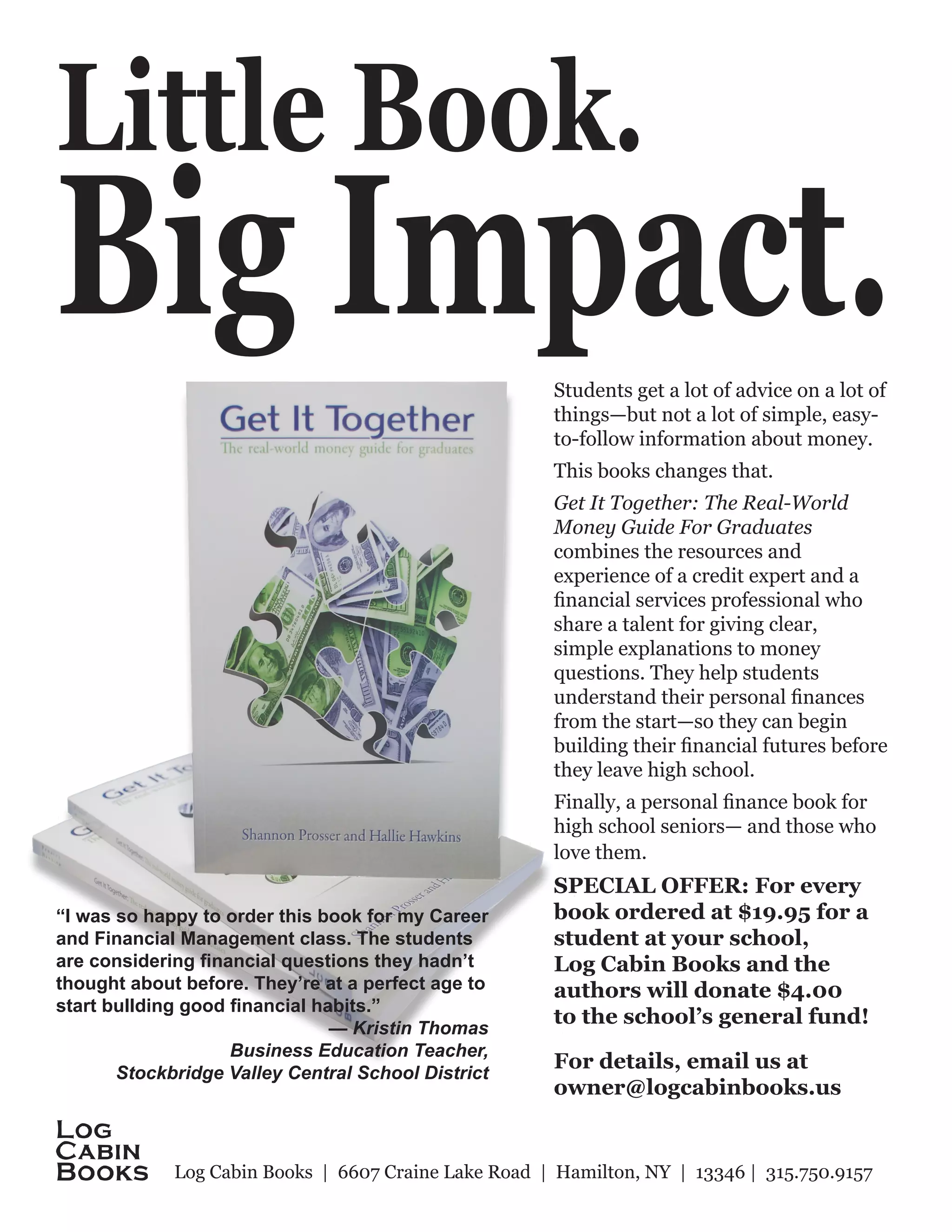 This document describes 'Get It Together: The Real-World Money Guide for Graduates,' a personal finance book aimed at high school seniors that provides clear and simple financial advice. The book is designed to help students understand personal finances and build good financial habits before graduating. A special offer allows $4.00 from each book purchase to be donated to the school's general fund.