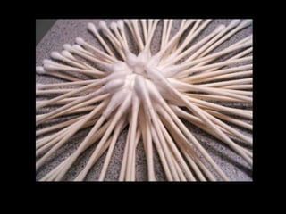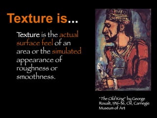 Texture refers to the surface feel or simulated roughness of an area. It can be found in nature, such as tree bark or bricks, and on objects like fur or fabric. In art, texture describes the surface quality of a work, whether actual or implied. There are two main categories of texture - real texture uses the actual surface of materials to create visual interest or feelings, while implied texture makes a 2D surface appear textured through techniques like brushstrokes.