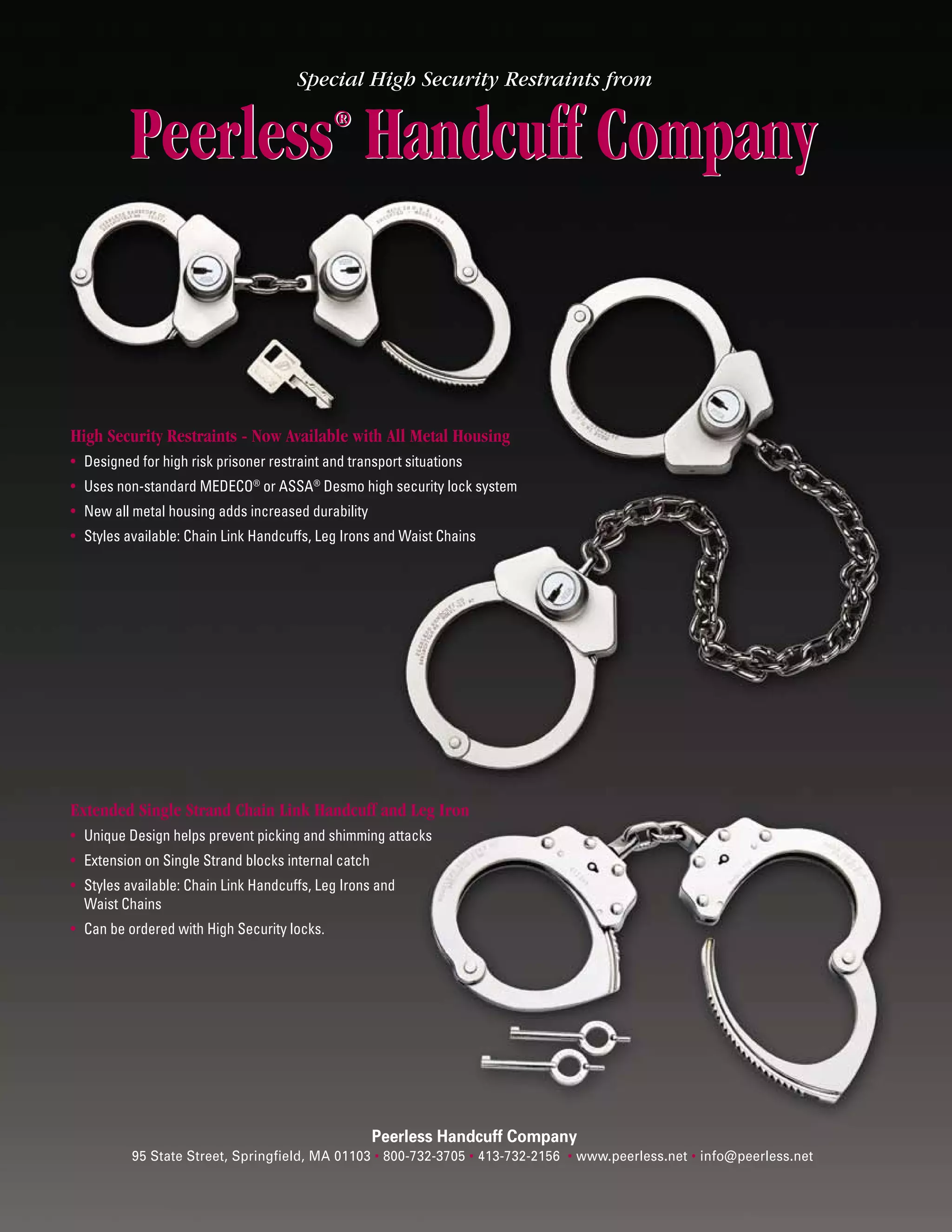 This document describes high security restraint products from Peerless Handcuff Company, including handcuffs, leg irons, and waist chains. The restraints feature non-standard high security locks and durable all-metal housing. An extended single strand chain link design helps prevent attempts to pick or shim the locks used for transporting high-risk prisoners.
