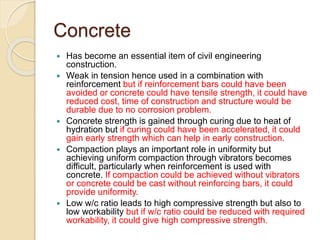 The document discusses advancements in high strength concrete (HSC) and high performance concrete (HPC), emphasizing their importance in civil engineering due to their enhanced properties like early strength, durability, and reduced permeability. It highlights the role of various materials and admixtures, such as pozzolanic materials and superplasticizers, in improving the performance of concrete mixtures. The paper also addresses challenges in achieving uniform compaction and workability while presenting different types of high-value concrete and their respective properties.