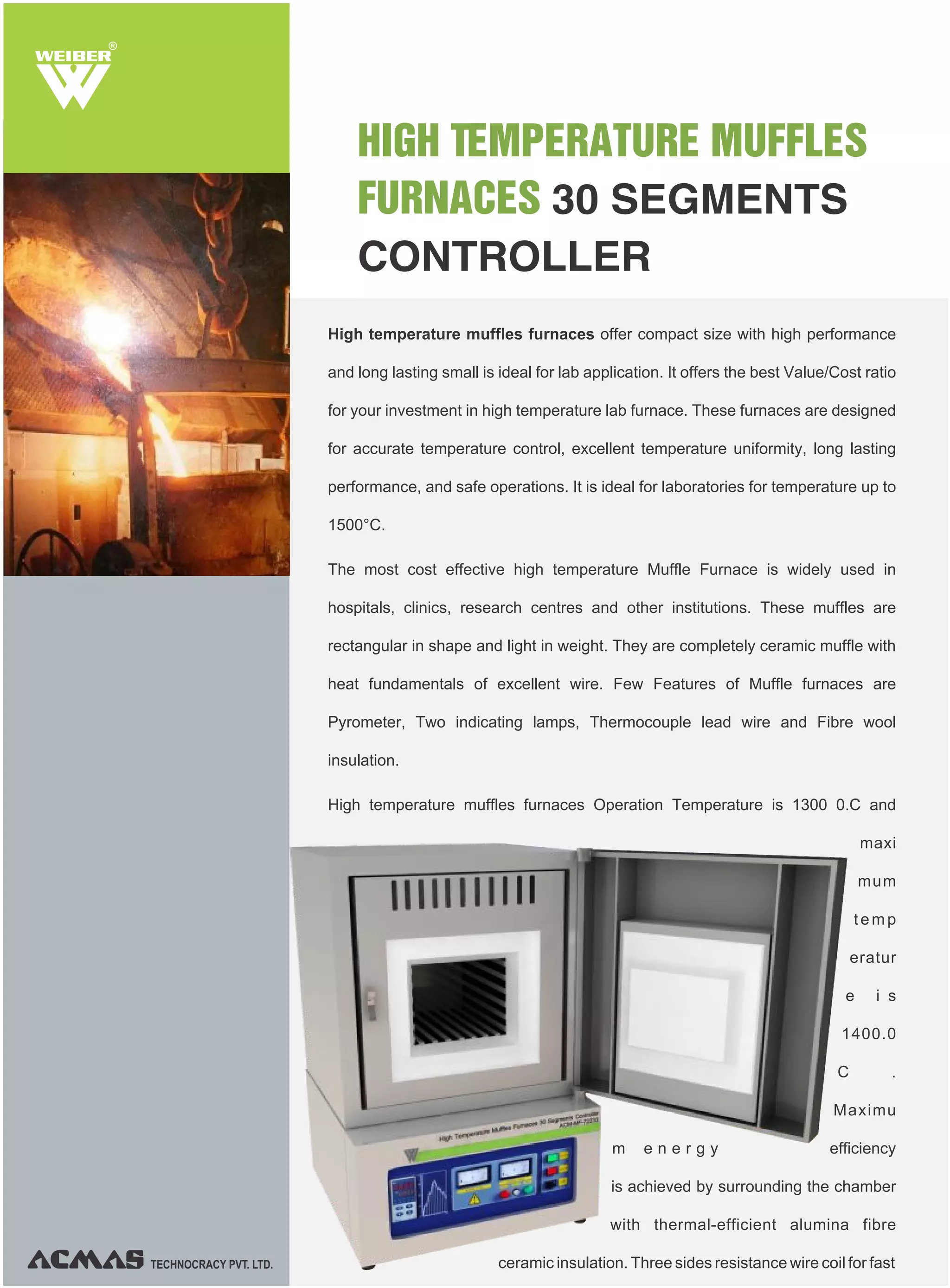 This document summarizes a high temperature muffle furnace. It can reach temperatures up to 1500°C and features precise temperature control and uniform heating. The furnace has a double-layer steel casing, ceramic refractory lining, and silicon carbide heating elements. It is an affordable and effective option for laboratories, hospitals, and research centers to treat samples at high temperatures.