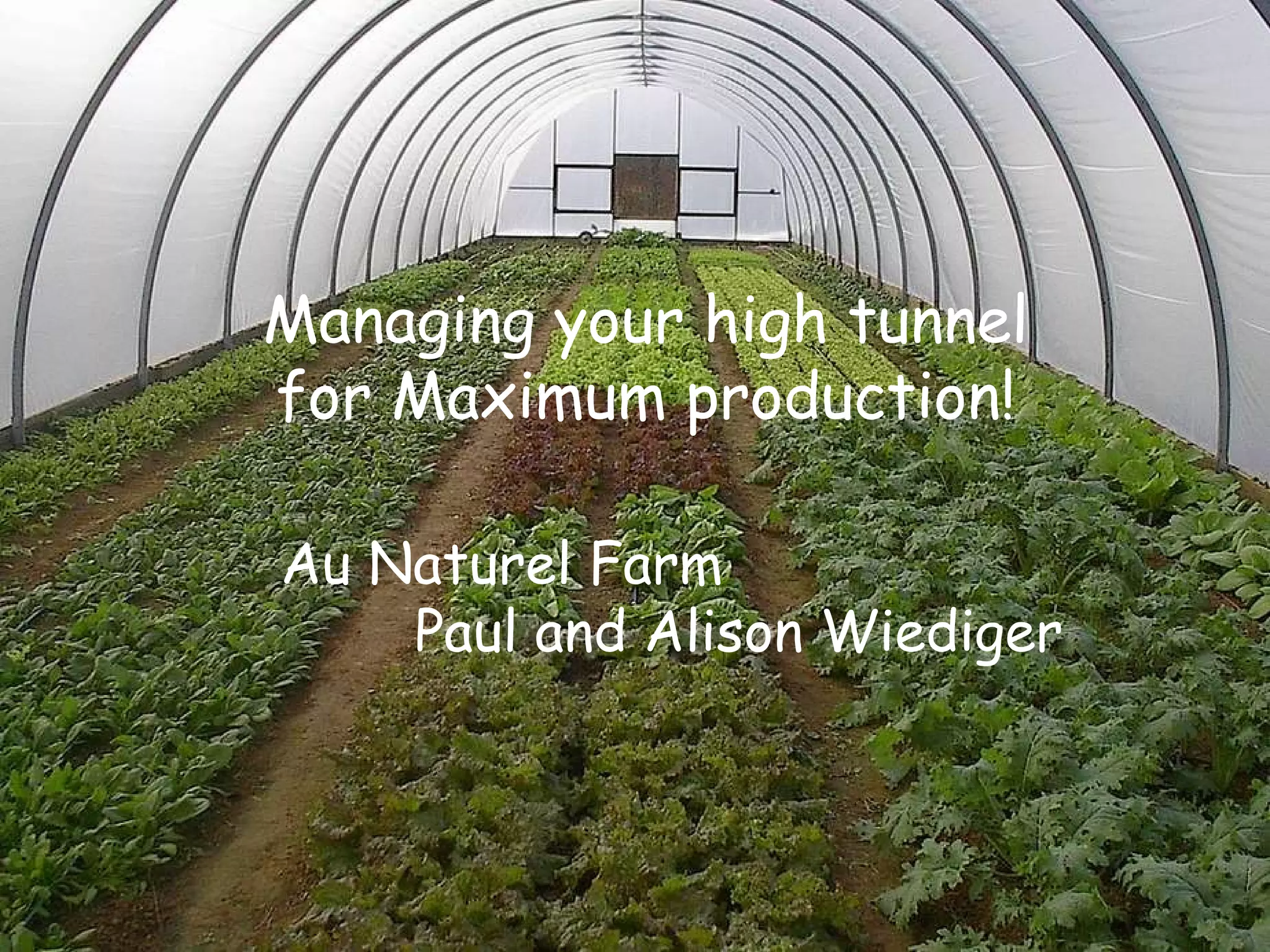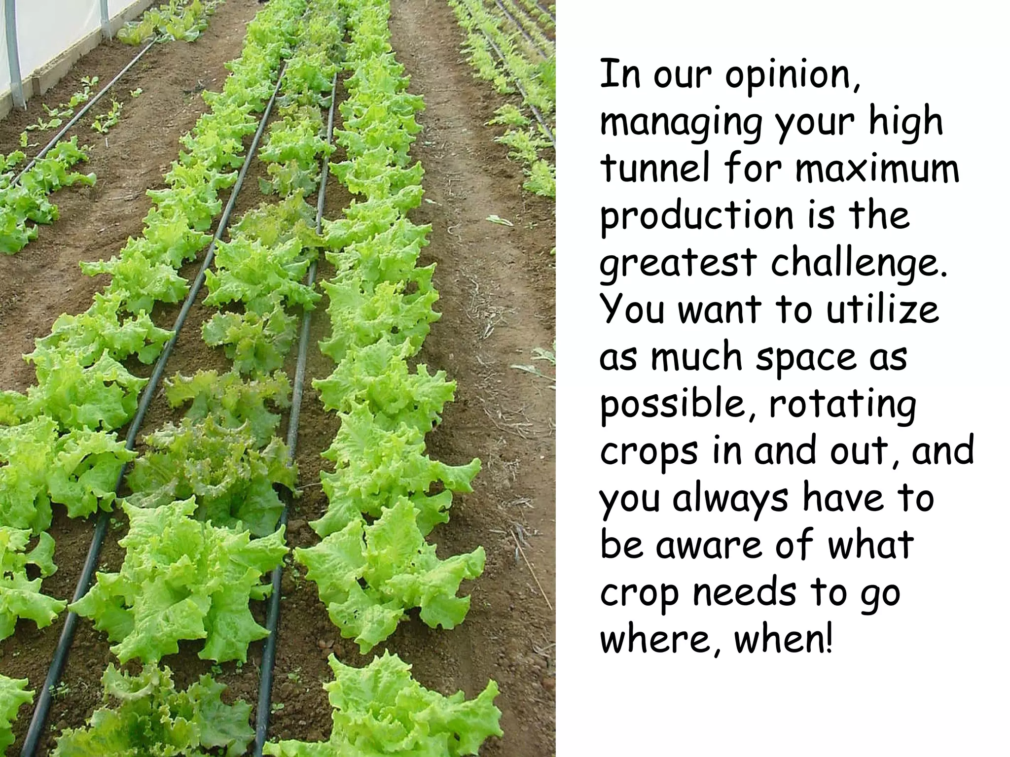 Managing a high tunnel for maximum crop production is challenging as you must utilize all available space by rotating crops in and out and keeping track of planting schedules. The document provides planting schedules and crop rotations for cool and warm season crops throughout the year to maximize production from a high tunnel. Record keeping of plantings, harvests, and temperatures is important for effective high tunnel management.